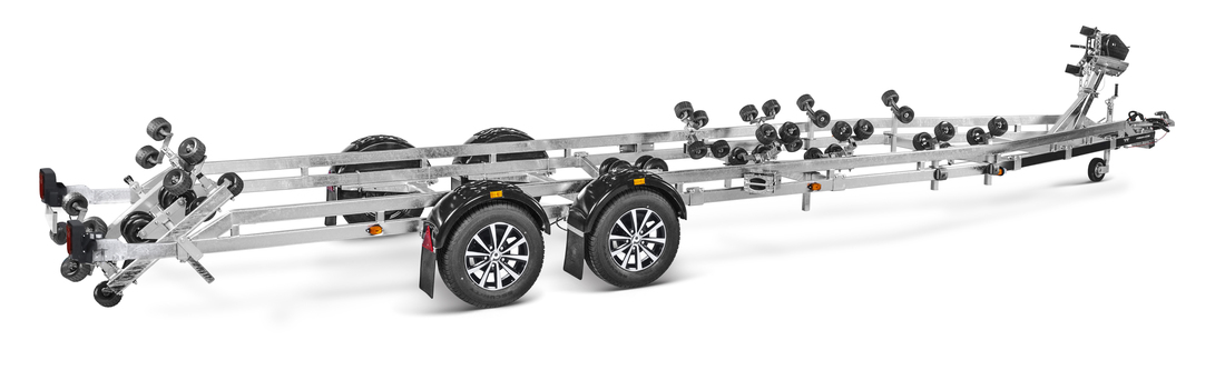 Fogelsta 303500TB SR X Är en dubbelaxlad och bromsad trailer för båtar upp till 30 fot. Utrustad med V-format, svetsat och förstärkt chassi och väldigt goda köregenskaper. X-line-kvalitetsrullar med låg inverkan på båtens skrov. Tippbar heavy duty superrullsvagga baktill med fyra super soft kölrullar, heavy duty superrullar framtill med fyra super soft kölrullar, en extra kölrulle och ett par dubbla sidorullar för enkel anpassning till din båt. Varmgalvaniserat chassi för lång hållbarhet. Elen är helt skyddad i båttrailerns chassi. Vattentäta hjullager förlänger livstiden. Helskyddad vinsch och vinschtorn som är enkelt att justera, vinschtornet är även utrustat med en extra säkerhetsvajer för användning vid transport. Justerbar teleskopisk belysningsenhet gör det lättare att använda båttrailern, vilket ger större flexibilitet, bekvämlighet och säkerhet på vägen. Helt vattentät lampenhet inklusive kontakt och kabel. Båttrailern på bilden kan vara extrautrustad.